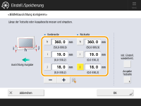 Kehren Sie zum Bildschirm <Bildfehlausrichtung korr.> zurück, und geben Sie die gemessene Länge von <i> und <j> (für langes Blatt: die gemessene Länge von <h>, <i> und <j>) für die Vorderseite und Rückseite ein.Mit den folgenden beiden Zahlenwerten und „h = 360,0“ (für langes Blatt: „h = 360,0/450,0/550,0/650,0“ für [h], das sich am nächsten zur Hinterkante des Papiers befindet) stellt sich ein Gerät so ein, dass der Druckbereich und das Papier parallel zueinander verlaufen.
