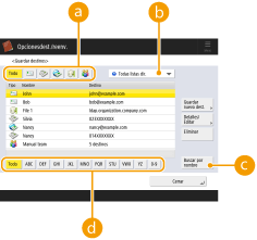 Para el administradorLa Libreta de direcciones y los botones de acceso rápido se pueden exportar/importar. Esto sirve para hacer copias de seguridad de datos por si se produce un fallo o para simplificar el procedimiento para registrar destinos entre equipos compatibles. Para obtener más información, consulte Copia de seguridad/restauración de datos. La Libreta de direcciones se puede personalizar para cada usuario conectado (Lista de elementos que se pueden personalizar). Además, se puede utilizar la función de opciones personalizadas para permitir que varias impresoras multifunción de Canon compartan la Libreta de direcciones (Sincronizar las opciones de varias impresoras multifunción Canon). Puede establecer una contraseña para evitar la edición o la eliminación no autorizadas en la Libreta de direcciones. Configuración de un PIN para la libreta de direcciones Si hay destinos que no desea que aparezcan en la Libreta de direcciones o si desea limitar el acceso de los usuarios a los destinos, introduzca un número de acceso al registrar un destino. Para utilizar el número de acceso, es preciso activar la configuración de antemano en Restringir el acceso a destinos registrados en la libreta de direcciones. Configure las listas de direcciones de grupos de usuarios en la IU remota. (Registrar destinos mediante la IU remota) |