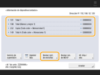 Pulse <Servicio de supervisión> <Prueba de comunicación> para comprobar la comunicación con el servidor de supervisión remota. Si se ejecuta esta función, la información del equipo se envía periódicamente al servidor de supervisión remota. Es necesario activar la comunicación entre el equipo y el servidor que ofrece el servicio para poder usar esta función.Puede imprimir una lista que muestra el número de páginas utilizadas para copiar, imprimir, escanear y enviar por fax. En esta pantalla, también puede consultar la información del contador para cada aplicación MEAP. Pulse <Revisar con. de MEAP> en la pantalla en el paso 2. Si pulsa <Inf. disp./otra> <Revisar conf. dispositivo> en la misma pantalla, puede consultar las opciones instaladas en el equipo y la versión del chip de seguridad relativo al cifrado de datos del disco duro.Para obtener más información sobre las condiciones de recuento, póngase en contacto con su distribuidor o representante del servicio técnico. |