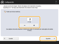 Cuantas más páginas de prueba se impriman, más preciso será el ajuste. Si especifica la impresión de varias páginas de prueba, asegúrese de que todas las páginas de prueba son escaneadas en el orden en que han sido impresas. Si se cambiara el orden o si el proceso de escaneado no se realizara sucesivamente, puede que el ajuste no se realice correctamente. |