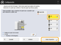 Limpie el cristal de copia y la parte inferior del alimentador antes de proceder al ajuste. Limpiar el cristal de copia/Limpiar el alimentador Utilice las condiciones siguientes para imprimir la hoja de referencia. El resultado del ajuste no será preciso si la hoja de referencia no se imprime adecuadamente. Tamaño de papel: A3 o 11" x 17" Acabado: No estucado, Estucado por una cara o Estucado por las dos caras Tipo: ninguno (normal) Peso de base: papel en el que pueda imprimirse a doble cara y de 80 g/m2 o más pesado (se recomienda papel de 200 g/m2 o más pesado) Si se corta incorrectamente o se dobla un borde de la página de prueba o si la imagen no se imprime correctamente sobre la página de prueba, puede aparecer el mensaje <Ponga correctamente la página de prueba en el cristal.> durante el escaneado. Puede que el ajuste no se realice correctamente con algunos tipos de papel, tales como papel con relieve y una superficie áspera o en papel coloreado. Si el ajuste no se realiza correctamente cuando está seleccionado <Usar escáner>, seleccione <No usar escáner>. |