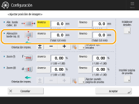Cuando vuelva a abrir la pantalla después de cerrarla al pulsar <Aceptar>, los valores de la pantalla volverán a '0'. Sin embargo, el valor ajustado seguirá teniendo efecto en cada campo Total. Si repite el paso, compruebe la longitud de 'i' en la página de prueba nueva e introduzca el valor nuevo. |