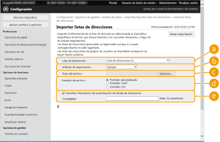 3 | Configure las opciones necesarias. ![]() [Listas de direcciones]Seleccione la lista de direcciones que es el destino de importación. [Método de importación]Seleccione [Agregar] si desea añadir los destinos importados sin eliminar la lista de direcciones actual, o seleccione [Eliminar y sobrescribir] si desea eliminar la lista de direcciones actual y sobrescribir los datos con los destinos importados. [Ruta del archivo]Haga clic en [Examinar...] y especifique el archivo para importar. [Formato de archivo]Seleccione el formato de archivo de los datos que se van a importar. Seleccione [Formato personalizado] para los archivos en el formato específico de las impresoras multifunción Canon (*.abk), seleccione [Formato LDAP] para los archivos con formato LDAP (*.ldif) o seleccione [Formato CSV] para los archivos con formato CSV (*.csv). [Descifrar información de autenticación de libreta de direcciones]Al importar archivos cifrados, seleccione la casilla de verificación e introduzca la misma contraseña introducida al exportar los datos de configuración. |
