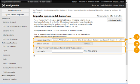 3 | Configure las opciones necesarias. ![]() La Libreta de direcciones actual se elimina y se sobrescribe con la información de la Libreta de direcciones importada. Al importar, no se puede realizar ninguna operación en la IU remota hasta que se reinicie el equipo. Por otra parte, las opciones importadas surten efecto tras reiniciar el equipo. Apagar/reiniciar el equipo ![]() [Formato de archivo]Seleccione el formato de archivo de los datos de configuración que se van a importar. Tenga en cuenta que el formato de archivo varía según el modelo de impresora multifunción que ha exportado los datos. Compruebe el archivo que se va a importar. [Ruta del archivo]Haga clic en [Examinar...] y especifique el archivo para importar. [Descifrar información de autenticación de libreta de direcciones]Al importar archivos cifrados, seleccione la casilla de verificación e introduzca la misma contraseña introducida al exportar los datos de configuración. |