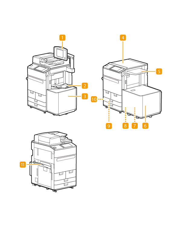 기기에 설치할 수 있는 옵션의 조합에 대한 자세한 정보는 가까운 공인 Canon 대리점에 문의하십시오. 일부 설정은 기기에 설치되어 있는 옵션 장비의 구성에 따라 표시되지 않을 수 있습니다. |
