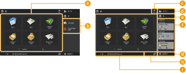 이러한 버튼을 사용하여 "복사" 및 "스캔하고 송신"과 같은 기본 기능 화면을 열 수 있습니다.