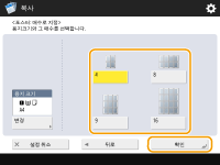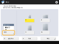 ![]() | 이미지를 확대하여 여러 용지에 복사한 후 여러 용지를 함께 결합하여 하나의 큰 포스터를 만들 수 있습니다. 여러 용지에 복사하는 두 가지 방법이 있으며 복사 비율만 지정하거나, 사용할 용지 매수를 지정하는 방법입니다. |