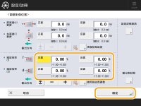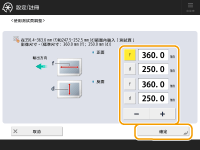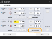 <f>: | 輸入測試頁上「f」記號的測量長度。 對於長紙張:輸入根據長紙張測試頁上測量的「f」記號長度計算而得的輸入值。 輸入值= ((預設「f」值:360 mm)/測量的「f」位置:450, 550, 650 mm)) x 測量的「f」值 |