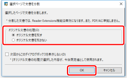 [次回からこのダイアログボックスを表示しない] | チェックマークを付けると、次回文書を分割する際に、[選択ページで文書を分割]が表示されません。チェックマークを付けた際の、[オリジナル文書の処理]の内容が既定値として使用されます。 |