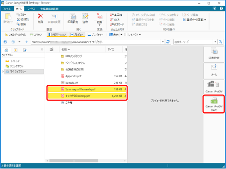 Desktopでは、文書を選択して、ファクスアウトプットボタンをクリック、または文書をファクスアウトプットボタンにドラッグ&ドロップして文書をファクス送信できます。この他に、簡単印刷ツール、Desktop Editorからもファクス送信ができます。