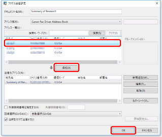 [アドレス一覧]で宛先を選択して、[追加]をクリックし、[OK]をクリックします。