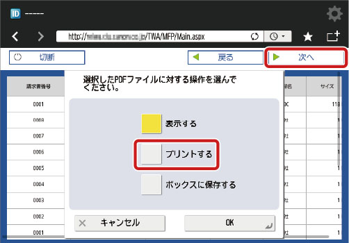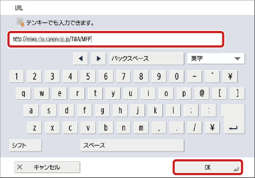 複合機の操作パネルから<ウェブブラウザ―>を押し、MFP PrintのURLを入力して[OK]を押します