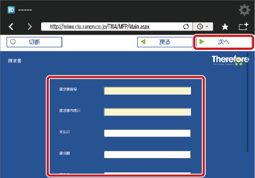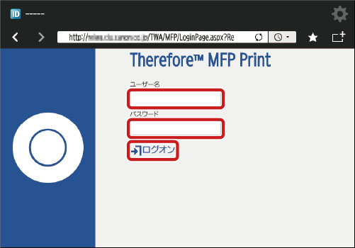 Therefore Online の場合は「https://<テナント名>.thereforeonline.com/MFP」、オンプレミスの場合は「http(s)://<サーバー名>/TWA/MFP」です。