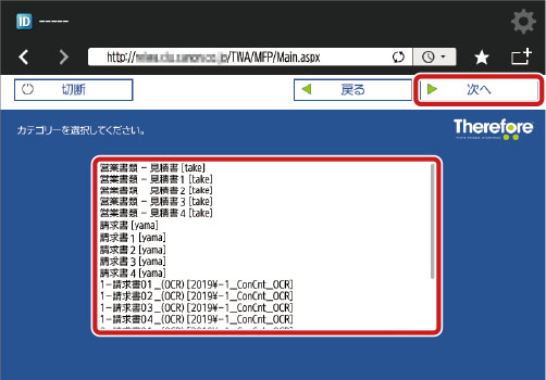 ユーザーが権限を持つカテゴリーのリストから、関連するカテゴリーを選択して[次へ]を押します