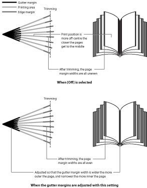 When sheets of paper are folded in half to make a booklet, the edges of the paper protrude more the closer the pages are to the center of the booklet. Margin width at the edges is narrowed, and part of the printing may also be cut off (depending on the number of pages and paper thickness when the edges are trimmed to make them even). Using creep correction to adjust the margin of the gutter can correct such uneven printing (creep).