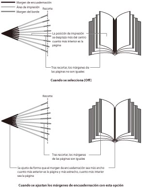 Cuando las hojas de papel están plegadas por la mitad para hacer un cuadernillo, los bordes del papel sobresalen más en las páginas que están en el centro del cuadernillo. El ancho de margen de los bordes está limitado, y es posible que parte de la impresión salga cortada (en función del número de páginas y el grosor del papel cuando los bordes están recortados para igualarlos). Con el uso de una corrección de desplazamiento para ajustar el margen de la encuadernación se puede corregir tal uniformidad en la impresión (desplazamiento).