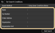 7 | Select <Start Search>. The users meeting your search criteria are displayed. ![]() If the authentication screen appears when you select <Start Search>, enter the user name of the machine and the password registered in the LDAP server, and select <Apply>. Registering LDAP Servers |
