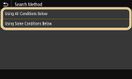 6 | Select conditions to display the search result. ![]() <Using All Conditions Below> Searches and displays the users that meet all the search criteria specified in steps 3 and 4. <Using Some Conditions Below> If users that meet even one of the criteria specified in steps 3 and 4 are found, displays all those users. |
