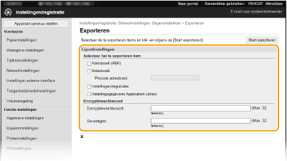 Voer een wachtwoord voor versleuteling van de exportdata in met behulp van alfanumerieke tekens. Voer hetzelfde wachtwoord in [Bevestigen]. Als het selectievakje [Adresboek] of [Instellingen/registratie] is ingeschakeld, kunnen de gegevens niet worden geëxporteerd zonder dat een encryptiewachtwoord is ingesteld.