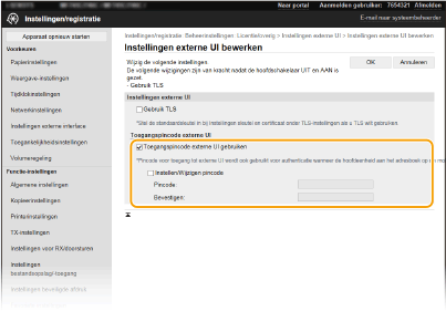 Het bedieningspaneel gebruikenU kunt de pincode-instellingen voor toegang tot de UI op afstand ook bereiken via <Menu> in het scherm Start. <Instellingen externe UI>