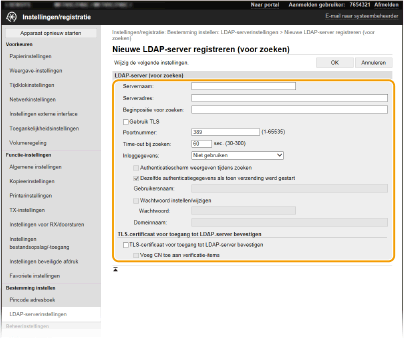 LDAP serverregistratie moet afzonderlijk worden verricht, hetzij om te zoeken, hetzij voor verificatie. Als u een LDAP-server wilt gebruiken voor het zoeken naar fax- en e-mailbestemmingen, registreer de server dan voor zoeken, en als u de server wilt gebruiken voor het verifiëren van verzenden van e-mail of faxen, registreer de server dan voor verifiëren.