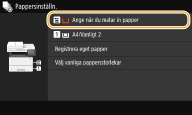 När du har registrerat standardpappersinställningar visas inställningsskärmen inte när du fyller på papper och samma inställningar används varje gång. Om du fyller på andra pappersformat eller papperstyper utan att ändra pappersinställningar blir utskrifterna kanske inte bra. För att undvika detta problem väljer du <Ange när du matar in papper> i steg 3 och fyller därefter på papper.