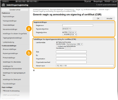 Da certifikater, der er blevet genereret på maskinen, ikke har en CA-signatur, kan der opstå en kommunikationsfejl afhængigt af de enheder, som den forsøger at kommunikere med. For at få certifikatmyndigheden til at udstede certifikatet med CA-signaturen skal du indhente data for CSR (Certificate Signing Request), som administratoren kan generere fra Brugerinterface til fjernbetjening. Når certifikatet er blevet udstedt, skal du registrere det i nøglen med den genererede CSR.