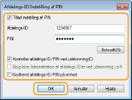 Indstilling af administration af afdelings-id'er til job fra computeren). Hvis afkrydsningsfeltet er valgt for denne indstilling, udføres jobbene dog, også selv om der ikke er indtastet id og pinkode. Hvis du ønsker at konfigurere en indstilling, så der ikke udføres noget job, med mindre korrekt afdelings-id og pinkode bliver indtastet, skal du fjerne markeringen i afkrydsningsfeltet.