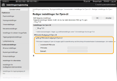 Brug af kontrolpaneletDer er også adgang til pinkodeindstillinger for Brugerinterface til fjernbetjening fra <Menu> på Hjem-skærmen. <Indstillinger for Fjern-UI>