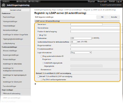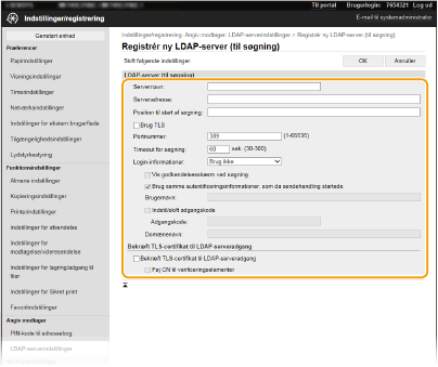 Klik på [Registrér ny server] for [LDAP-server (til søgning)] eller [LDAP-server (til autentificering)].