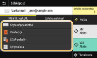 Jos toimistoon on asennettu LDAP-palvelin, voit määrittää vastaanottajan käyttämällä palvelimessa olevia käyttäjätietoja. Avaa LDAP-palvelin laitteen avulla, etsi asiaankuuluvat käyttäjätiedot ja määritä ne vastaanottajaksi.