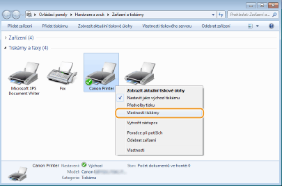 Klikněte pravým tlačítkem na ikonu ovladače tiskárny pro dané zařízení a klikněte na možnost [Vlastnosti tiskárny] nebo [Vlastnosti].