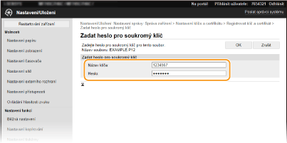 [Nastavení klíče a certifikátu] nebo [Nastavení certifikátu CA].