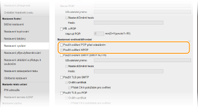 Toto políčko zaškrtněte, chcete-li používat server POP3 pro ověřování před odesláním e-mailů nebo i-faxů.