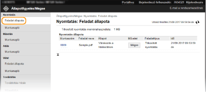 A [Munkaszám] elemre kattintva részletes információkat tekinthet meg a felfüggesztett és a védett dokumentumokról. Ellenőrizheti a felhasználónevet és a kinyomtatott dokumentum oldalszámát.