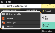 Ha ki van választva egy rendeltetési hely a <Címjegyzék> menüből a Főképernyő képernyőn, akkor megjeleníthető az Alapvető funkciók képernyő az e-mail küldéséhez vagy a fájl mentéséhez, miközben a kiválasztott rendeltetési hely marad megadva.