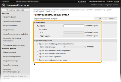 [Ограничение функций] Можно ограничить количество печатаемых страниц и доступные функции для регистрируемых отделов. Чтобы ограничить количество печатаемых страниц, установите флажок для требуемого типа и введите соответствующее число страниц в поле [Количество страниц]. Установите флажок функций, использование которых требуется ограничить.