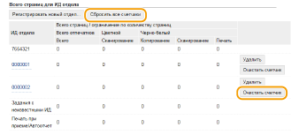 При необходимости обнулить счетчик страниц щелкните ссылку имени подразделения и затем щелкните [ИД отдела] и [Очистить счетчик]  [OK]. При необходимости сбросить счетчик страниц для всех имен подразделения щелкните [Сбросить все счетчики]  [OK].