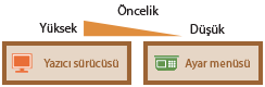 Ayarların önceliğiBir yazdırma ayarı, hem yazıcı sürücüsünden hem de makinenin işletim panelinden belirtilmiş ise, yazıcı sürücüsünden yapılmış olan belirtim, işletim panelinden yapılmış olanı geçersiz kılar. İşletim panelinden yapılmış olan belirtim, PS/PCL yazdırma ve UNIX'ten veya yazıcı sürücüsünü desteklemeyen diğer işletim sistemlerinden yazdırma işlemi gibi belirli bazı durumlarda geçerli olur.