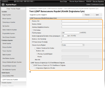 LDAP sunucusu tarafından uygulanan kimlik doğrulama türüne bağlı olarak [Kullanma], [Kullan] veya [Kullan (Güv. Kmlk Doğrulaması)] öğesini seçin. [Kullan] veya [Kullan (Güv. Kmlk Doğrulaması)] öğesi seçildiğinde kullanıcı adı ve parola belirtilmelidir.