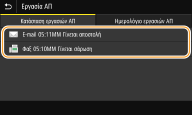 Όταν η επιλογή <Εμφάν.Ημερολογίου Εργ.> έχει οριστεί στη ρύθμιση <Off>, δεν μπορείτε να ελέγξετε τα αρχεία καταγραφής εργασιών για τα απεσταλμένα έγγραφα. <Εμφάν.Ημερολογίου Εργ.>