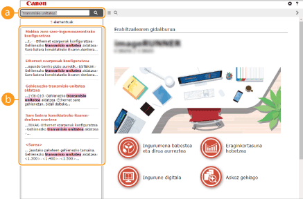 bilaketa-pantaila bistaratzeko. Gakoen bidezko bilaketak burutzeko testu-lauki bat dauka, bilatzen ari zaren orrialdea aurkitzeko.