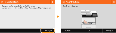 Hainbat kasutan, errore bat gertatzen denean, erroreari erantzuna emateko argibideak bistaratzen dira. Jarraitu pantailako argibideei errorea konpontzeko. Adibide gisa, ondoren papera trabatzen denean bistaratzen den pantaila agertzen da.