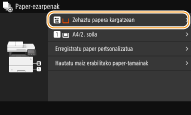 Paper-ezarpen lehenetsia erregistratu ondoren, papera kargatzean ez da paper-ezarpenen pantaila bistaratuko eta beti ezarpen bera erabiliko da. Paper-ezarpenak aldatu gabe beste paper-tamaina edo mota bat erabiltzen baduzu, baliteke makinak behar bezala ez inprimatzea. Arazo hau saihesteko, hautatu <Zehaztu papera kargatzean> 3. urratsean eta ondoren kargatu papera.