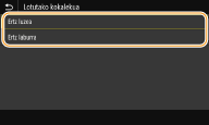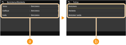 Ezarpenen lehentasunaInprimatzeko ezarpen bat inprimagailuaren kontrolatzailetik eta makinaren eragiketa-paneletik zehazten bada, inprimagailuaren kontrolatzaileko zehazpenak eragiketa-panelekoa baliogabetuko du. Eragiketa-paneleko zehazpena hainbat kasutan gauzatuko da, adibidez PS/PCL inprimatzea edo UNIX bidezko inprimatzea burutzean edo inprimagailuaren kontrolatzailerik onartzen ez duen beste sistema eragile bat erabiliz inprimatzerakoan.
