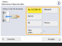 1 | Premeu <Sobre>. No es pot seleccionar el tipus de paper sobre a la pantalla Detalls de <Tipus de paper>. Per seleccionar el tipus de paper sobre, deseu el tipus de paper <Desar paper favorit (safata multiús)>, després premeu <Paper favorit> al pas 2 el botó al qual s'ha assignat el tipus de paper sobre <Acceptar>. Desament de mides i tipus de paper utilitzats freqüentment per a la safata multiús |