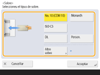 2 | Seleccioneu el tipus de sobres. ![]() Per desar un sobre de mida personalitzada, premeu <Person.> <Següent> i <X> o <Y> per especificar el costat; després, utilitzeu les tecles numèriques per introduir la llargada del costat especificat. |