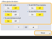 <To de mode repòs> | So que s'emet quan l'equip entra en mode repòs o s'apaga si establiu <Opcions inici ràpid per l'alimentació principal> en <On>. (Depenent de les situacions, l'equip no s'inicia ràpidament i el to no sona.) |