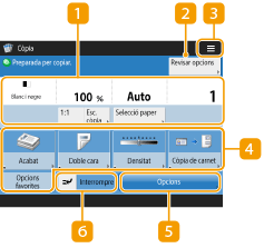 Mostra l'estat de l'opció, com l'escala de còpia, la mida de paper i el nombre de còpies. Assegureu-vos de confirmar les opcions per copiar correctament. Per modificar les opcions, premeu el botó que hi ha a sota de la secció de la pantalla.