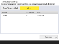 <Dies restants> mostra el nombre esperat de dies restants fins que es requereix la substitució, en funció de l'ús passat. Encara quan es mostra <Cal canviar-ho.> a <Dies restants>, no realitzeu la substitució fins que es mostri un missatge que us indiqui que substituïu els consumibles a l'àrea d'exhibició d'estat (a la part inferior de la pantalla del tauler tàctil). El mesurament de <Dies restants> no es completa durant un temps després de la posada en funcionament de l'equip i es visualitza <1 any o més> durant aquest temps. Els dies restants que es mostren després d'aquest temps poden ser extremadament petits de manera temporal. |